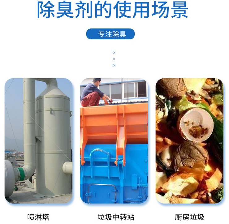 除臭劑主要應用與,垃圾填埋場,垃圾處理廠,污水處理廠,垃圾中轉站,垃圾堆肥站,垃圾焚燒廠等。固廢除臭劑可有效的去處硫化氫,氨氣,二氧化碳,甲liu醇,胺等多種常見的惡du氣體。